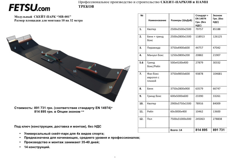 Виходячи з мого особистого досвіду відвідувань скейт-парків в різних країнах і містах України, пропонується побудувати парк з прохідністю близько 500 осіб на добу, з 16 фігурами на вік 6-25 років, з зоною безпеки для малюків.
